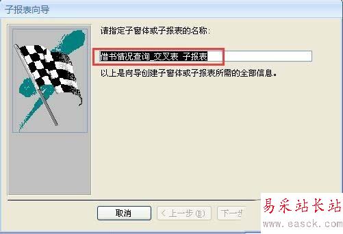 3、彈出“子報(bào)表向?qū)?rdquo;對(duì)話框,在對(duì)話框中輸入子報(bào)表名稱,單擊“完成”按鈕,完成子報(bào)表的創(chuàng)建。