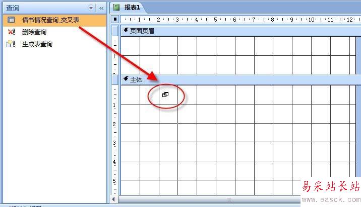 2、在導(dǎo)航窗格中選擇要用到的表或查詢,按住鼠標(biāo)左鍵將其拖動(dòng)到設(shè)計(jì)視圖的“主體”節(jié)中。