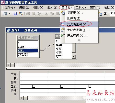 三、連接好表之后,點擊菜單欄的查詢--交叉表查詢。就可以出現(xiàn)交叉表界面。這里我們要理解行標題、列標題和交叉值。
