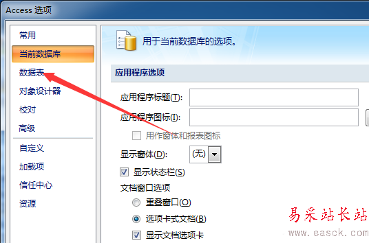 4、就會彈出了一個access選項窗口中,選中左側中的數據表的選項。