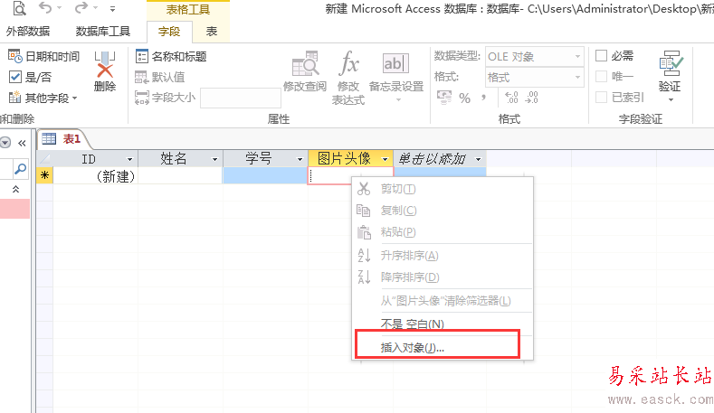 5、設置成OLE對象類型后,就可以在此字段的的單元格中右鍵,選擇插入對象了,如果字段類型沒設成OLE對象,右鍵操作不會出插入對象的選項