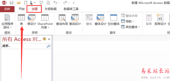 2、打開這個數據庫,切換到創建,點擊表,創一個表,需要的可以進行一下重命名,這里直接以表1作為命名