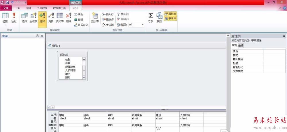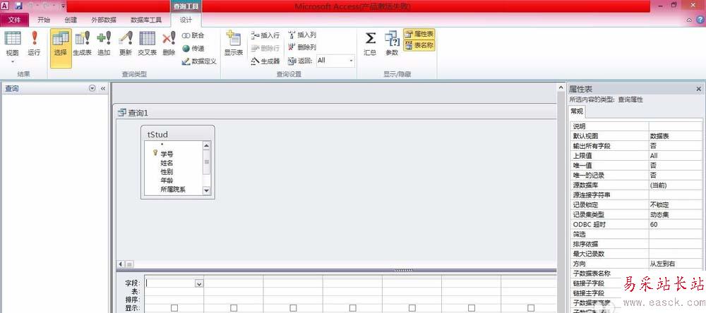 2、在【創建】功能區的【查詢】分組中單擊“查詢設計”按鈕,系統彈出查詢設計器。
