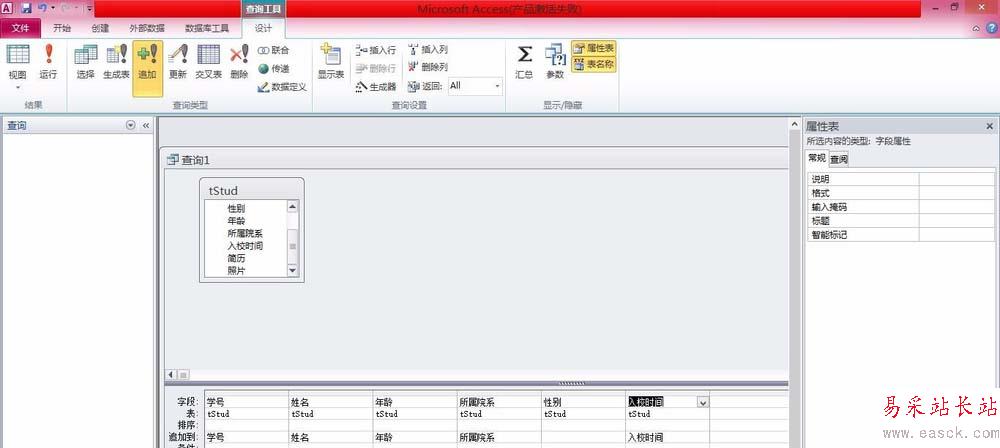 5、雙擊“學號”、“姓名”、“年齡”、“所屬院系”、“入校時間”、“性別”字段。