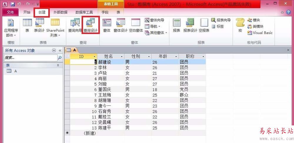 2、選擇菜單欄中的“創建”→“查詢設計”。