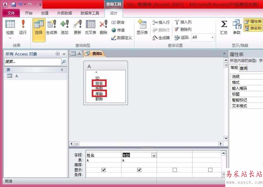 4、添加完成“表A”后,雙擊“姓名”“年齡”字段添加。