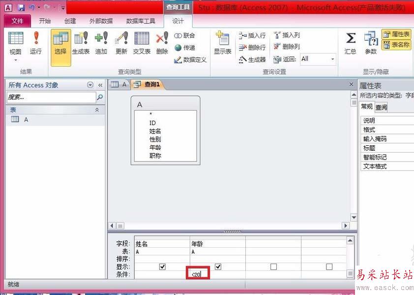 5、在“年齡”的條件框中輸入“<20”。