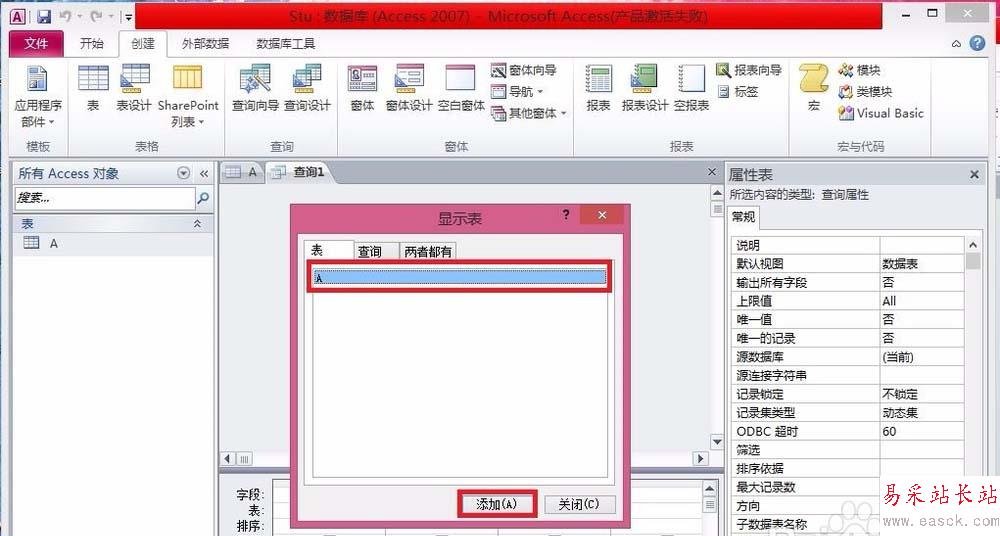 3、彈出“顯示表”窗口后,選中表A,選擇添加。