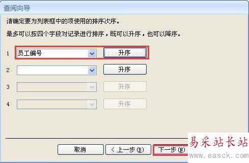 4、設置添加后字段下拉列表中各記錄的排序依據和方式,本例選擇“員工編號”,單擊“下一步”按鈕。