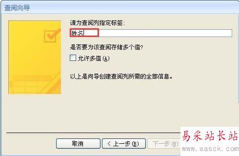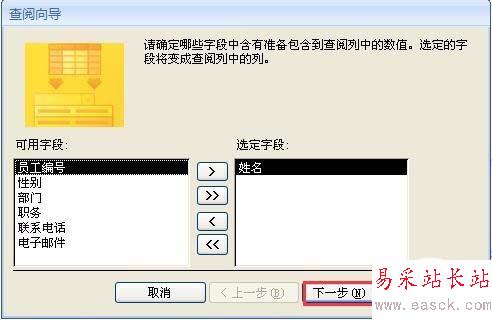 3、打開“查閱向導”對話框,在左側列表中選擇要添加的字段,單擊右尖括號按鈕將其添加到右側列表中,本例我們保持默認設置,單擊“下一步”按鈕。