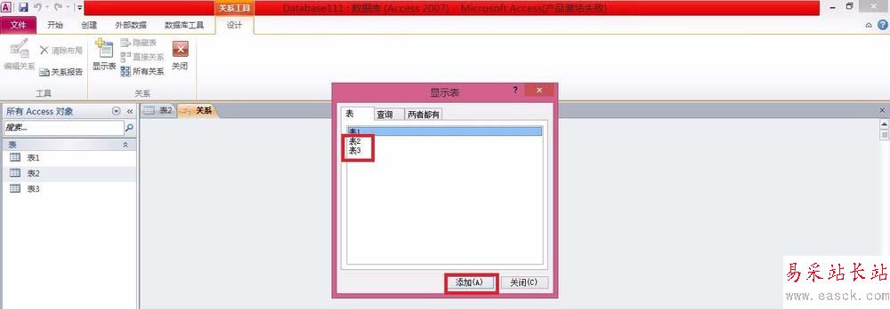 1、首先,打開包含三個數據表的數據庫。選擇添加表2與表3之間的聯系。
