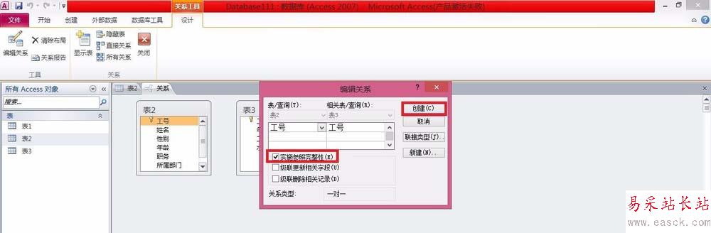5、彈出“編輯關系”窗口,勾選“試試參照完整性”,點擊“創建”按鈕。