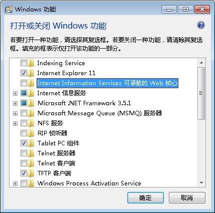 4、在‘Internet Information Services’下的‘web管理工具’中找到IIS相關功能,在前面的復選框中打勾后,單擊確定。
