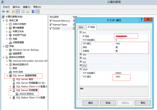 2. 服務器上 win + R 鍵入 compmgmt.msc ,打開 計算機管理,按照如圖所示 設置。注:IPAll 一欄 TCP端口必須設置,不然連接不上!!! 設置完成后,重啟一下 Sql Server 服務。