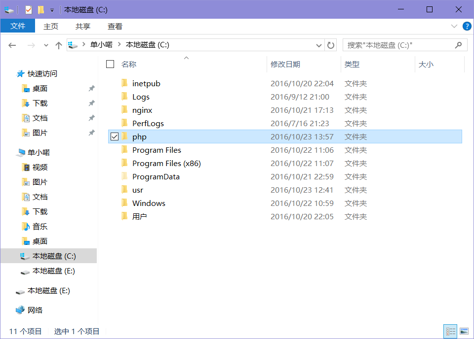 3、解壓PHP壓縮包文件到C盤根目錄,并且重命名為php