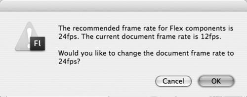 由于所有的Flex程序默認(rèn)以每秒24幀的速度運(yùn)行,所以Flash IDE會(huì)顯示一個(gè)對(duì)話框詢問(wèn)是否要把元件轉(zhuǎn)換成24fps。(圖21-2)