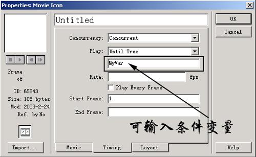 在設置屬性對話框中,經常會遇到條件等文本框,定義的變量即可在文本框內使用,例如圖4所示的電影圖標屬性對話框,其中的【play】域的條件文本框內即可輸入包含變量的條件表達式。類似的應用場合還包括條件響應的條件表達式等等。