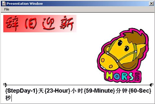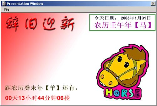 每年除夕夜人們總有一個"倒計"的習慣,借此總結自己一年來的得與失,迎接新的農歷年的到來。讓我們把計算機的系統時間調整為2003年1月31日,利用authorware 6.5一起來設計制作這個電子"羊年倒計時"程序。程序執行預覽如圖10所示。