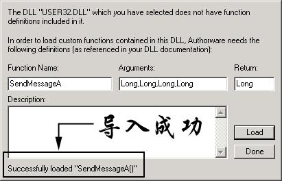 3.假如是導入u32(ucd)內封裝的函數,則會出現如圖8所示的界面,此時選擇好欲導入的函數后單擊按鈕"load"導入即可。如果要在函數列表中同時導入多個函數,可以按住"ctrl"同時用鼠標進行點選。假如是導入dll內封裝的函數,則會出現如圖9所示的界面,輸入相關的函數名和參數類型后單擊按鈕"load"即可,成功導入后在窗口的左下角有一提示信息。如此重復導入其它的dll函數,導入完畢后單擊按鈕"done"結束dll函數導入工作。