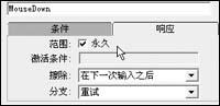 6. 在主流線上拖入一個交互圖標,命名為“音量控制”,在交互圖標的右側拖入一個群組圖標,選擇類型為“條件”,選定該條件響應,在屬性面板中,選擇“條件”標簽,將條件設置為“mousedown”;再選擇“響應”標簽,將“永久”選項選中(如圖4、圖5所示)。