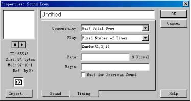 下面的例子中,我們將對聲音的播放進行控制,播放的次數隨機地從最多3次,最少1次,該控制可以在設置聲音的對話框中設置,如圖6-46所示在【fixed number of times】選項的正文輸入框中輸入隨機函數randow(1,3,1)來生成對聲音播放次數的控制。