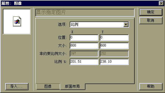 2.打開“顯示指定圖片”顯示圖標(biāo),執(zhí)行“文件→導(dǎo)入...”,.隨意導(dǎo)入一幅圖片,并選中“l(fā)ink to file”復(fù)選框。.然后雙擊剛才輸入的圖片,將打開圖象屬性對(duì)話框(圖三),在“文件”輸入框中將文件名改為: