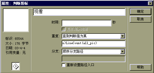 三.雙擊“觀看”決策圖標(biāo),.在打開的屬性對(duì)話框中(我用的是中文版),將“重復(fù)”的值改為“直到判斷為真”,并在其下方的輸入框中輸入(見圖二):