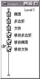 在這里,顯示對象層次的級別只限于在運動過程中,也就是說,顯示對象在運動的過程中遵循層次級別的重疊方式。當顯示對象運動到目的地靜止后,顯示對象之間的重疊方式則不再遵循設定的層次級別方式,靜止后的重疊方式由程序主流程線上【移位】設計按鈕的先后位置決定(如圖4-6所示)。