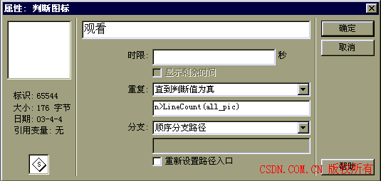 三.雙擊“觀看”決策圖標,.在打開的屬性對話框中(我用的是中文版),將“重復”的值改為“直到判斷為真”,并在其下方的輸入框中輸入(見圖二):