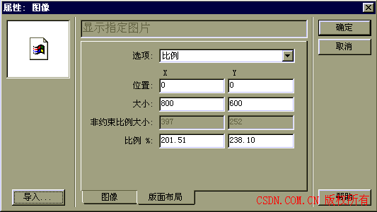 為了改變圖片的大小(如做課件時往往使圖片覆蓋整個屏幕),可繼續(xù)對“版面布局”進行相應設置(圖四):“選項”中選中“比例”;“位置”項中x和y代表圖片出現(xiàn)的位置;“大小”項中即代表每張圖片的像素大小。