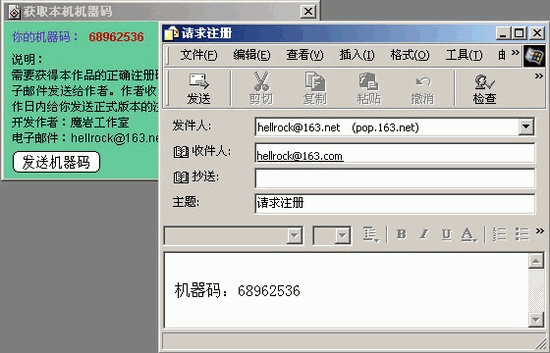 shellexecutea(windowhandle,"open","mailto:hellrock@163.com?subject=請求注冊&body=機器碼:"^hardserialnumber,"","",5)