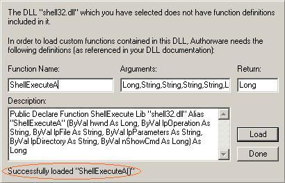 其中shellexecutea是windows(或winnt)系統目錄下shell32.dll的一個封裝函數,提醒大家注意windows(或winnt)目錄下有豐富的dll動態連接庫,這些都是可以為authorware所利用的擴展函數,導入方法和導入u32函數方法類似,具體可以參考下圖6.21,當導入成功后就會出現如圖6.21左下角的成功提示信息。