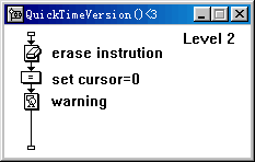 由于在系統中未安裝quicktime播放器時,qtvr文件是不能被播放的,所以這時的提示信息對用戶非常重要。在quicktimeversion()<3分支上的組圖標中設計如圖5所示的程序流程。其中擦除圖標的作用是擦除程序開始時的提示信息。計算圖標的作用是將光標形式轉變為原先的箭頭光標,其中的語句是:setcursor(0)。顯示圖標warning的作用是告知用戶系統中未安裝quicktime 3或以上版本的播放器,此時系統不支持播放qtvr文件。