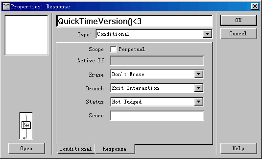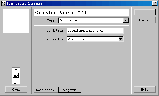 拖一個交互圖標到顯示圖標之后,命名為detect qt。分別拖3個組圖標到此交互圖標的右邊,形成2個條件響應分支和1個按鈕響應分支。2個條件響應分支的匹配條件分別是quicktimeversion()<3和quicktimeversion()>=3。這兩個分支的屬性設置見圖3和圖4所示。quicktimeversion是xtra quicktimesupport類的系統函數,它返回系統中已安裝的quicktime播放器的版本號。當版本號<3時,系統不支持播放qtvr文件;當版本號>=3時,系統支持播放qtvr文件。最后的按鈕響應分支命名為exit,這是為正常退出程序而設計的,將其屬性中的scope選為perpetual并在分支中設計一個含quit()函數的計算圖標即可。