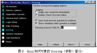 8. 在接下來如圖6所示的窗口中,主要確定系統是立即判斷答案正誤(judge user response immediately)還是顯示檢查答案按鈕(display check answer button)。若選中后者,則點擊該檢查按鈕后系統再判斷答案正誤。最后一項是設置及格成績(passing score),默認為70%。