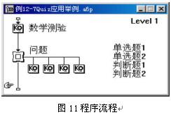 圖11是程序流程圖,從圖中可以看出,quiz的程序流程結構有兩部分:主流程線上的圖標“數學測驗”是向導程序,框架框標下掛的知識對象圖標是題目,本例設置了四個題目——兩道單選題和兩道判斷題。如果你要修改某個題目,只要雙擊與題目相對應的知識對象即可。