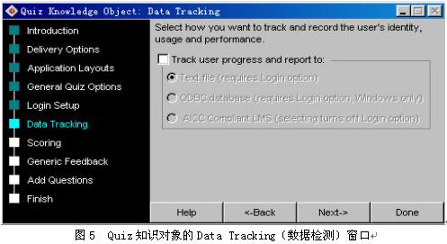 7. 點擊“next”進入數據跟蹤設置窗口,選擇是否跟蹤記錄用戶使用情況和成績等數據(track user progress and report to),若需記錄,則需選擇一種數據保存方式。默認不保存,如圖5所示。