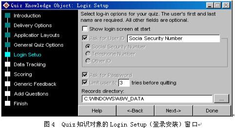 6. 點擊“next”進入登錄設置窗口。要求選擇在測驗開始時是否顯示用戶登錄畫面,如果選擇“顯示登錄窗口”(show login screen at start),那么可以選擇用戶id類型(ask for user id)、是否要求密碼輸入(ask for password)、是否設置登錄次數限制(limit user to__tries before quitting)。本窗口最后一項是要求確定記錄文件的存放目錄(records directory),缺省為“c:/windows/a6w_data”,用戶可根據實際確定。如圖4所示。