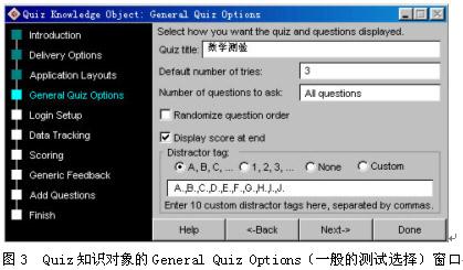 5.在接下來的窗口中要求設置測驗標題(quiz title)、缺省嘗試次數(default number of tries)、回答問題的數量(number of questions to ask);選擇是否隨機提問(randomize question order) 選項與是否顯示最后得分(display score at end)選項,并要求確定題目編號形式(distractor tag)。如圖3所示。
