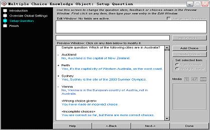 (2)在圖13所示窗口中點擊“run wizard...”按鈕,運行添加題目向導,出現如圖14所示的窗口。該界面與添加單選題時的類似,在預覽窗口(preview window)中,最上面幾行是題目,下面列出的是供選擇的答案以及對該答案進行正誤判斷時作出的反饋信息。備選答案前面的“+”表示該備選答案是正確的,“-”表示該備選答案是錯誤的。在此窗口中點擊題目或答案項,則相對應的內容就會出現在窗口上半部分的“edit window”中,我們可以根據需要對它進行編輯處理(注意每次輸完信息后按回車)。