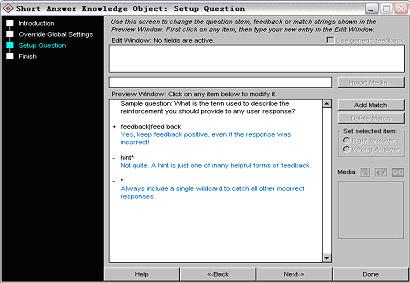 與前面幾類題型一樣,在圖13所示窗口中單擊“short answer”按鈕,然后在接下來出現的窗口中編輯好文字標題(如“簡答題”),點擊“run wizard...”按鈕,將出現如圖20所示的窗口。