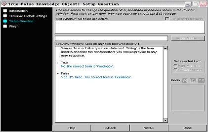(1)在圖13所示窗口中單擊“true/false”按鈕,然后在接下來出現的窗口中編輯好文字標題(如“是非判斷題”),點擊“run wizard...”按鈕,將出現如圖17所示的窗口。與前幾類題型一樣,在預覽窗口(preview window)中,前面的幾行是題目,下面是是非判斷以及判斷后的反饋信息。其使用方法和注意點與前面一樣,在此將不再闡述。需要注意是:“+”后面是正確的答案和反饋,“-”后面是錯誤的答案和反饋,只認符號不要認文字;預覽窗口中的英文是一道樣題,而不是在進行操作說明。
