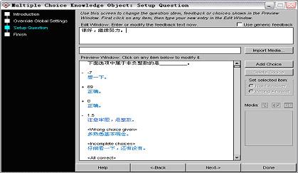 與單選題不同的是,多項選擇的預覽窗口下面出現了“wrong choice given”、“incomplete choices”和“all correct”三項,分別表示答題錯誤、漏選、全部正確時的反饋信息,你也可以根據需要選中相關選項,對其進行編輯處理。