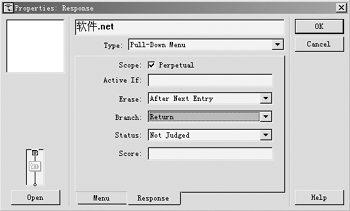 在主流程線上拖一個(gè)交互圖標(biāo),命名為“file”,在其右側(cè)放一個(gè)組圖標(biāo)(內(nèi)容為空),在彈出的“response type”對(duì)話框中,選擇“pull-down menu”(菜單交互)。雙擊組圖標(biāo)上方的小方塊,彈出屬性對(duì)話框,在“response”選項(xiàng)卡中,將“perpetual”復(fù)選項(xiàng)選中,其他選項(xiàng)就用默認(rèn)的好設(shè)置。