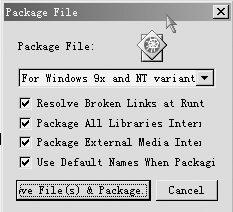 什么,打包您還不會(huì)?那沒有關(guān)系,那就點(diǎn)擊菜單“file→publish→package…”,然后彈出“package file”對(duì)話框,在“package file:”下拉列表中選擇“for windows 9x and nt…”,其他設(shè)置如圖5所示,點(diǎn)擊“save file(s) && package”按鈕就行了。authorware會(huì)把打包后的執(zhí)行文件放到源程序所在的目錄下,并且打包后的文件與源程序文件同名。
