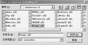 輸入結(jié)束后,別忘了要保存一下喔!這時(shí),系統(tǒng)會(huì)給出一個(gè)“where is function getsubmenu()?”對(duì)話框,詢問在哪里可以找到這些函數(shù)(如圖4)。這些函數(shù)都是authorware自帶的,它們都藏身于winapi.u32。通常情況下,您可以在authorware的安裝目錄下找到它,找到后打開就行了。友情提示:先輸入再找函數(shù)的好處是省得您一個(gè)個(gè)地加載函數(shù)。
