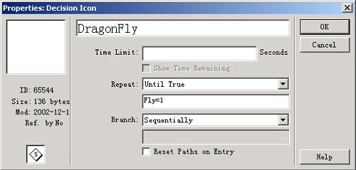 繼續(xù)在程序流程上添加一決策圖標(biāo),并命名為"dragonfly"。快捷鍵ctrl+i調(diào)出決策圖標(biāo)屬性對話窗口,選擇【repeat】決策分支循環(huán)域選擇為"until true",并在其下的條件輸入框內(nèi)輸入條件:fly=1,其中"fly"是一自定義變量,默認(rèn)初始值為0。保持【branch】分支域為默認(rèn)的"sequentially"順序執(zhí)行即可。上面的屬性設(shè)置表示當(dāng)fly=1的時候,停止決策分支的循環(huán)執(zhí)行,反之fly=0的時候則按決策分支順序循環(huán)執(zhí)行分支頁面內(nèi)容。最后的屬性設(shè)置如圖4所示。