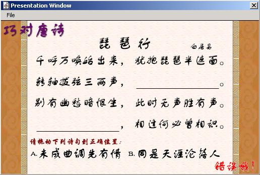 程序執行表現為:預覽圖中的古詩有兩斷句,要求學生選擇正確答案,并將答案拖至詩中正確位置。