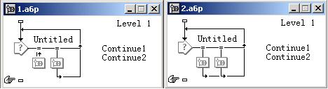 如圖16所示,左邊"1.a6p"的程序流程當響應"continue1"交互分支后,程序會繼續判斷交互分支"continue2"是否滿足響應條件;而右邊"2.a6p"的程序流程則在響應"continue1"交互分支后,全然不顧"continue2"交互分支是否滿足響應條件而直接返回到交互圖標入口處等待下次的交互響應。由此可見,假如當前交互分支有可能被不斷的重復響應執行,并且它右邊還有其它的交互分支,那么需要把此分支的交互返回類型設置為"continue"而不是"try again"。