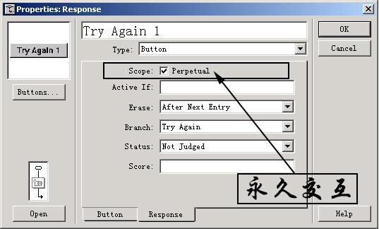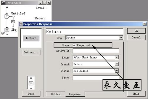 "try again"是authorware 6.5最常見的一種分支返回類型。"try again"返回類型的程序流程走向:當交互分支完成響應后,程序返回交互圖標入口處,等待下一次的交互響應。如圖14所示的兩個程序流程是完全不同的,左邊"1.a6p"的程序流程并不會自動執行到群組圖標"其它流程內容",而右邊"2.a6p"的程序流程則在執行到交互圖標后會繼續執行群組圖標"其它流程內容",同時等待用戶進行交互響應。如何產生這兩種不同的程序流程?其實右邊的程序把兩個分支都設置為永久交互,如圖15所示,因此也就產生了和左邊截然不同的程序流程走向。